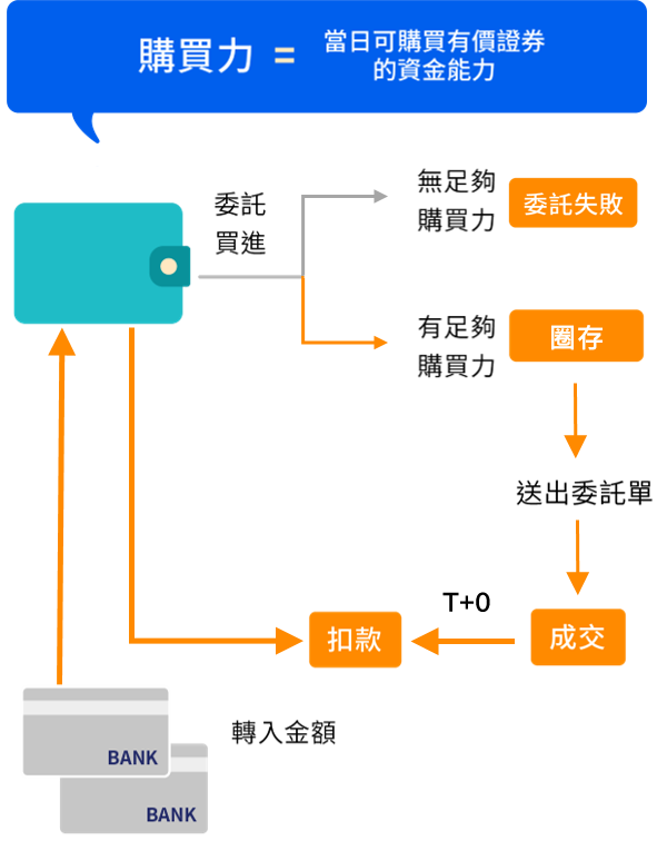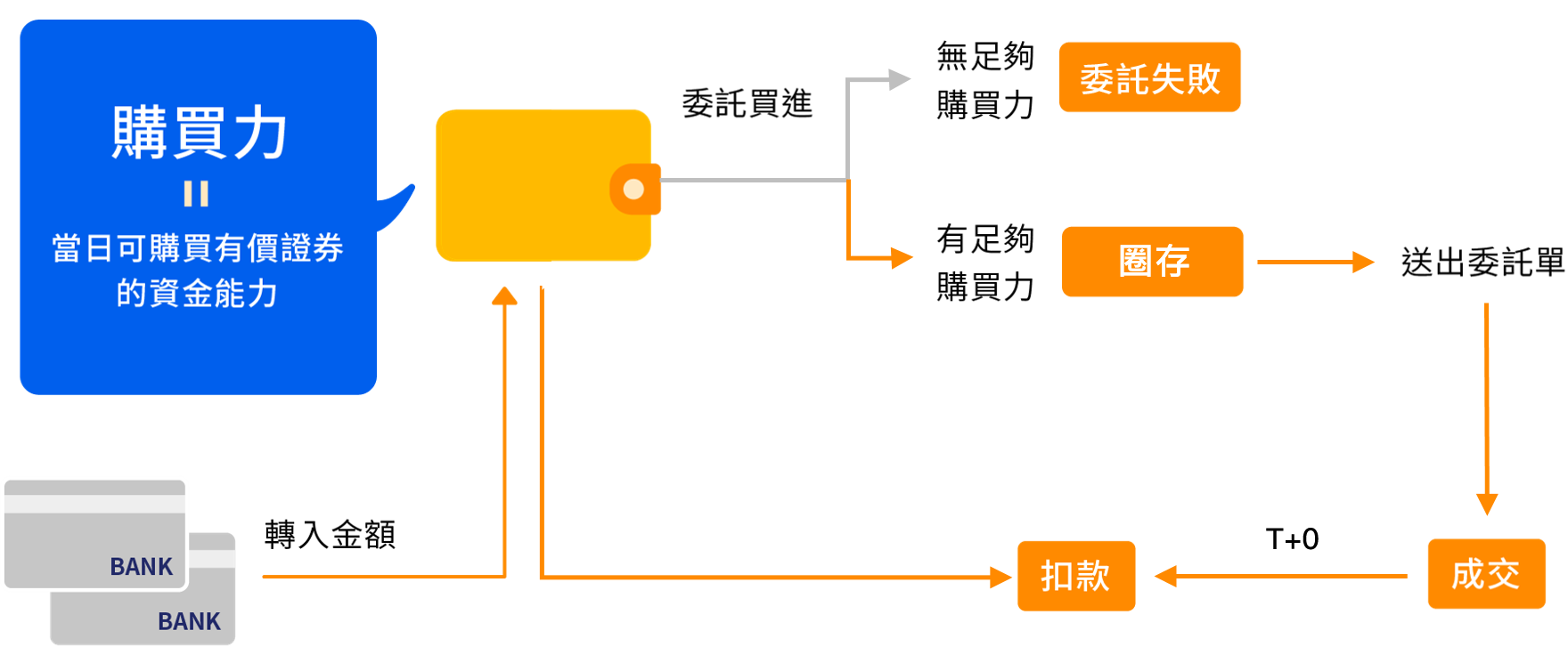 購買力 = 帳上現金餘額 + [入金 - 出金 + 前日在途款淨額 ] - [ 現股買進委託金額(含手續費) + 現股賣出成交金額(扣除手續費及交易稅) ]